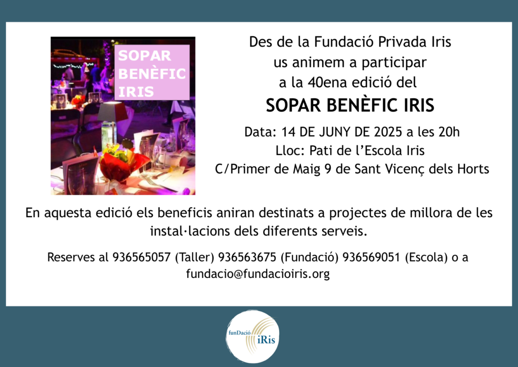 El pròxim 14 de juny, la Fundació Iris celebra la 40a edició del seu Sopar Benèfic, una cita molt especial per compartir complicitats, generar aliances i continuar treballant per millorar la qualitat de vida de les persones amb discapacitat intel·lectual.